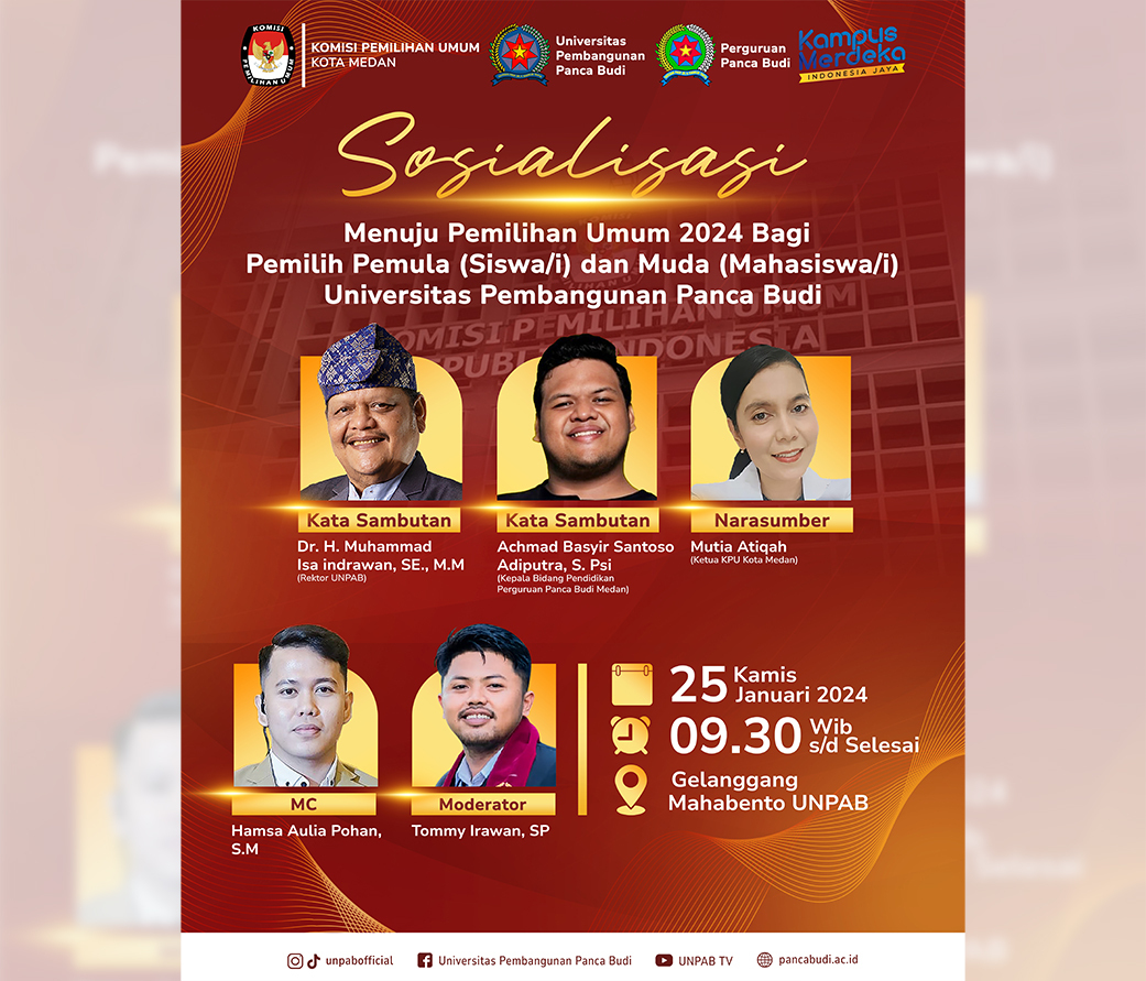 Halo sobat UNPAB!! Yuk... Kita hadirin Kegiatan yang akan dilaksanakan di Kampus Bareng Narasumber yang Berkompeten dibidangnya. Kegiatan kali ini Bertema : "Sosialisasi Menuju Pemili..